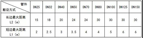 對(duì)于本文所述系統(tǒng)由固定點(diǎn)起,允許不裝補(bǔ)償器的直管段最大長(zhǎng)度民用建筑為33m,工業(yè)建筑為42m。(管道伸長(zhǎng)量分別為40mm和50mm)。實(shí)際設(shè)計(jì)時(shí)一般每段臂長(zhǎng)不大于20~30m,不小于2m。在自然補(bǔ)償兩臂頂端設(shè)置固定支架。“г”型補(bǔ)償器一般用于DN150以下管道;最大允許距離與管徑關(guān)系見(jiàn)表1。“Z” 型補(bǔ)償器可以看做兩個(gè)“г”型補(bǔ)償器。