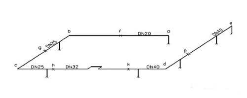 c-d段上設(shè)h和k點(diǎn),這樣g-c和c-h形成“г”型補(bǔ)償器, k-d和d-p形成另一“г”型補(bǔ)償器。根據(jù)管徑查表1知c-h長(zhǎng)度介于2.5m到18m之間,本系統(tǒng)定為15m; k-d長(zhǎng)度介于3m到20m之間,本系統(tǒng)定為15m.。h-k長(zhǎng)度為33m設(shè)置一個(gè)方形補(bǔ)償器,詳見(jiàn)國(guó)標(biāo)圖N106,本不再贅述。設(shè)定好固定支架和補(bǔ)償器的系統(tǒng)如圖2所示。