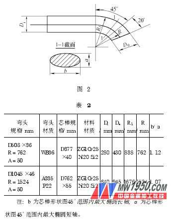 本文研究了彎頭推制工藝對彎頭幾何形狀的影響。通過對坯料、芯棒、溫度和推進(jìn)速度對彎頭曲率半徑、截面不圓度和壁厚影響的研究,得出結(jié)論: D/ Dp ( 彎頭截面直徑/ 坯料外徑) = 1. 33 ~1.40 ;b/ a ( 芯棒橢圓截面長軸/ 芯棒橢圓截面短軸) = 1.06 ~1.10 ; WB36 材質(zhì)加熱溫度最高點= 880 ~900 ℃,A335 P22 材質(zhì)加熱溫度最高點= 900 ~920 ℃ ; 推進(jìn)速度≤1000 δ/2 D ( δ— 彎頭壁厚,D —彎頭截面直徑) 。