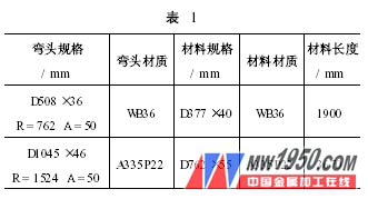 如果實際選用的管坯外徑比按公式計算得到的Dp值小,與模具貼合性能好,但彎頭內(nèi)弧容易失穩(wěn)起皺。如果實際選用的管坯外徑比按公式計算得到的Dp 值大,結(jié)果則正好相反。根據(jù)上述原則,對本次試驗用推制彎頭采用的推制管坯見表1 ( A 為彎管左段部分) 。