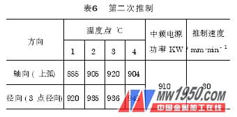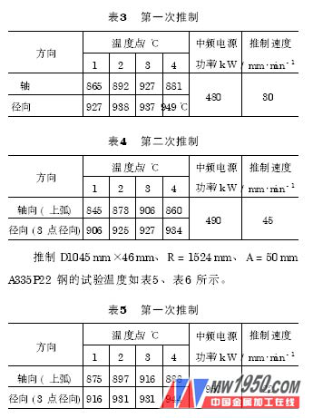 溫度分布是一個重要的工藝參數(shù),由感應(yīng)圈形狀及感應(yīng)圈與芯棒頭相對位置直接控制。感應(yīng)圈形狀是主要因素,感應(yīng)圈與芯棒頭相對位置是次要因素。溫度沿芯棒頭軸向分布規(guī)律為低、中、高、中,溫度沿芯棒頭徑向分布規(guī)律為低、中、高。加熱溫度高,推制彎頭壁厚增大。推制D508mm×36mm、R = 762mm、A = 50mmWB36 鋼的試驗溫度如表3 、表4 所示。