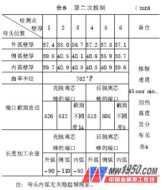 ( 5) 推制彎頭的檢測結(jié)果及分析 對推制彎頭用測厚儀檢測了外弧、側(cè)弧和內(nèi)弧壁厚,用平臺劃線方式檢測了曲率半徑、端口截面直徑和長度加工余量。D508mm×36mm、R = 762mm、A = 50mm WB36彎頭的檢測結(jié)果如表7 、表8 所示。