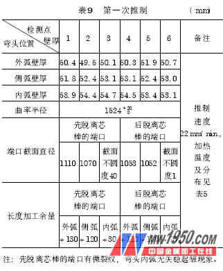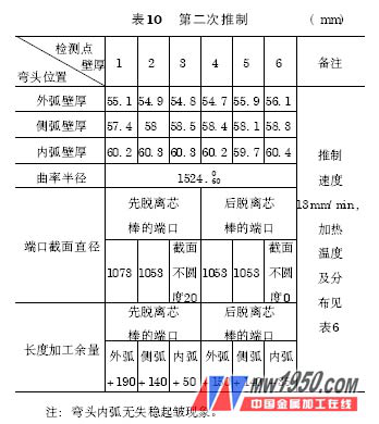 從表9 、表10 的對比中: 推制速度加快9mm/ min,曲率半徑加大84mm,即推制速度加快,曲率半徑加大。推制速度加快,加熱溫度升高,壁厚減薄5mm,即加熱溫度升高,壓縮量增大,推制速度加快,壓縮量減少。先脫離芯棒的端口,截面不圓度減少20mm,即推制速度降低,溫度升高,與模具貼合性能增強(qiáng)。