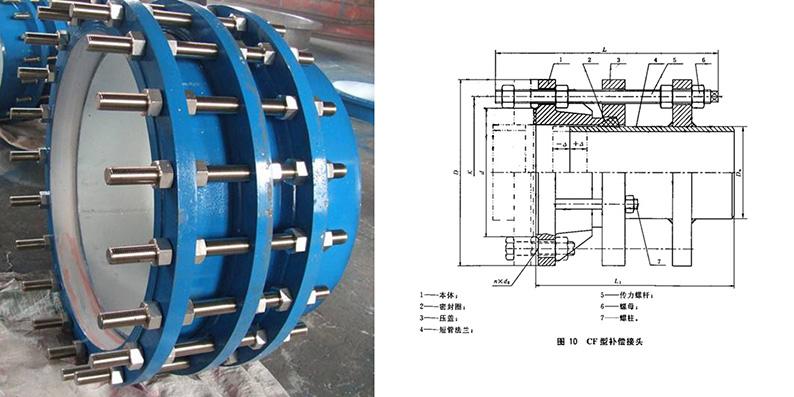 單法蘭松套傳力接頭,型號(hào)VSSJAFG(1999標(biāo)準(zhǔn))或CF(2007標(biāo)準(zhǔn))型,由法蘭式松套伸縮接頭和短管法蘭、傳力螺桿等構(gòu)件組成。它能傳遞被連接件的壓力推力(盲板力)和補(bǔ)償管路安裝誤差,不能吸收軸向位移主要用于與泵、閥門等附件的松套連接。
