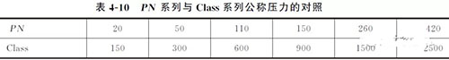 PN 和Class后面的數(shù)字并不代表法蘭實際所能承受的工作壓力,對于管路補償接頭給定的PN 或Class法蘭的最大允許工作壓力要根據(jù)法蘭材料和工作溫度,在相應(yīng)法蘭標(biāo)準(zhǔn)的壓力-溫度額定值中查取。PN 系列與Class系列間的相互對應(yīng)關(guān)系見表4-10。