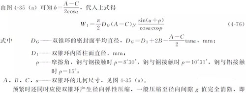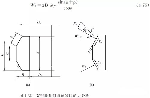 為達到初始預(yù)緊密封,雙錐密封面上必須施加的法向壓緊力W0=πDGby。預(yù)緊時,雙錐環(huán)收縮,與頂蓋有相對滑動趨勢,使雙錐環(huán)受到摩擦力Fm 的作用,管路補償接頭的摩擦力的方向如圖4-35所示,其大小為Fm =W0tanρ=πDGbytanρ。Fm 和W0 作矢量合成后再分解到垂直方向就是預(yù)緊時主螺栓必須提供的載荷W1,即