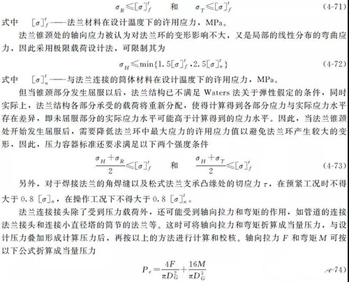 在壓力容器設(shè)計中,對于法蘭連接結(jié)構(gòu),不但要避免其強度失效,更要避免其密封失效。因此,壓力容器標(biāo)準(zhǔn)中法蘭設(shè)計規(guī)定的強度條件實際上是采用管路補償接頭的限制法蘭環(huán)中的應(yīng)力來同時限制法蘭變形。
