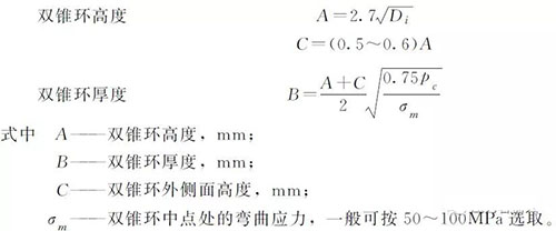 該結(jié)構(gòu)中雙錐環(huán)可選用20、25、35、16Mn、20MnMo、15CrMo及0Cr18Ni9等材料制成,在其兩個密封面上均開有半圓形溝槽,并襯有軟金屬墊,如退火鋁或退火紫銅等。合理地設(shè)計雙錐環(huán)的尺寸,使其有適當(dāng)?shù)膭傂?保持有適當(dāng)?shù)幕貜椬跃o力是很重要的。