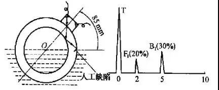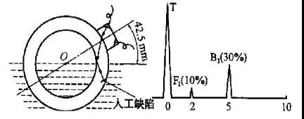 (3) 繼續(xù)旋轉(zhuǎn)樣管將人工缺陷完全浸入水中,此時探頭中心線距水面周向距離為42.5mm,波幅變化情況如圖6所示。可見,B1與上種情況相同,為滿幅的30%,F(xiàn)1則降至滿幅的10%(-9.5dB),B1和F1均比原始狀態(tài)衰減9.5dB,由此可以看出水浸探傷能量衰減的嚴(yán)重程度。若管路補(bǔ)償接頭樣管完全被水浸沒,能量衰減會更加嚴(yán)重。