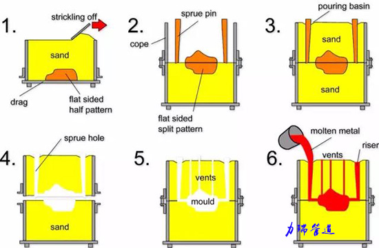 砂型鑄造:在砂型中生產(chǎn)鑄件的鑄造方法。鋼、鐵和大多數(shù)有色合金鑄件都可用砂型鑄造方法獲得。