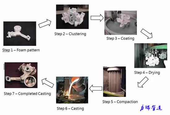 消失模鑄造(又稱實(shí)型鑄造):是將與鑄件尺寸形狀相似的石蠟或泡沫模型粘結(jié)組合成模型簇,刷涂耐火涂料并烘干后,埋在干石英砂中振動造型,在負(fù)壓下澆注,使模型氣化,液體金屬占據(jù)模型位置,凝固冷卻后形成鑄件的新型鑄造方法。