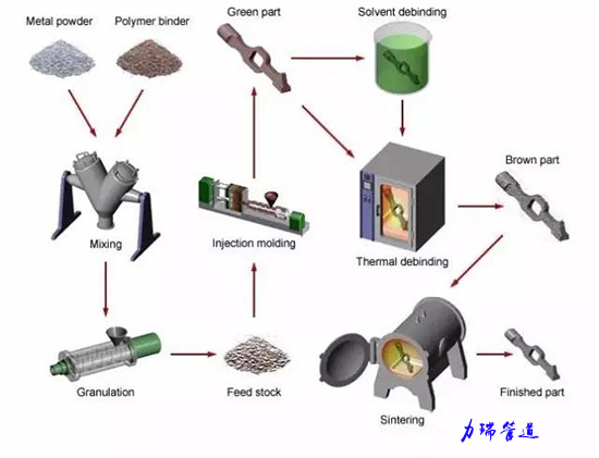 MIM流程分為四個(gè)獨(dú)特加工步驟(混合、成型、脫脂和燒結(jié))來實(shí)現(xiàn)零部件的生產(chǎn),針對產(chǎn)品特性決定是否需要進(jìn)行表面處理。