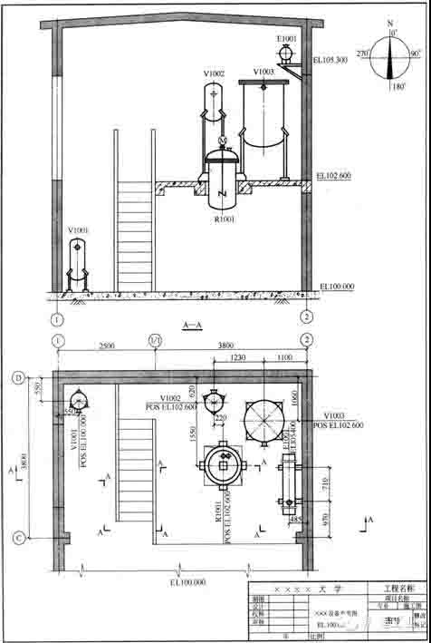 (2)尺寸 圖中要標注與設備定位有關的建筑物定位軸線的編號、設備支承點(POS)標高和設備管口的標高、設備的名稱與位號等。圖中尺寸的單位除標高及總平面圖以米為單位外,其他尺寸均以毫米為單位。地面設計標高為EL100.00。