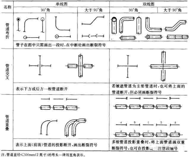 管道流程線要用水平和垂直線表示,管道轉彎處一般畫成直角。應避免穿過設備或交叉,在不可避免時,將其中一管道斷開一段,一般同一物料線交錯,按流程順序“先不斷、后斷”;不同物料線交錯,按“主不斷、輔斷”繪制。