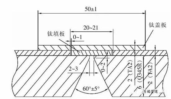 母材材質:覆層為TA2鈦板,基層為Q345R鋼板。母材厚度:覆層為2 mm,基層為16 mm。鈦填板、鈦蓋板材質均為TA2,厚度均為2 mm。