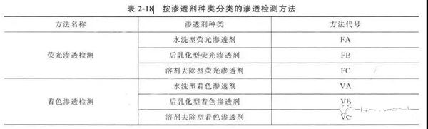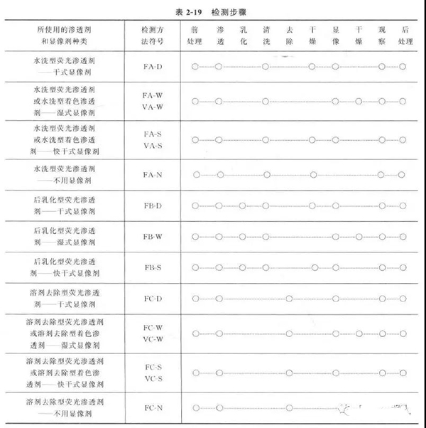 根據顯像劑和滲透劑種類不同,滲透檢測方法的分類見表2 - 17 和表2 - 18 ,各種方法組合使用的檢測步驟見表2 - 19 。