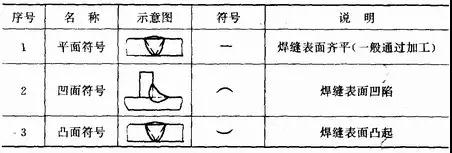 輔助符號(hào)是表示焊縫表面形狀特征的符號(hào),見(jiàn)表1—5。應(yīng)用示例見(jiàn)表1—6。