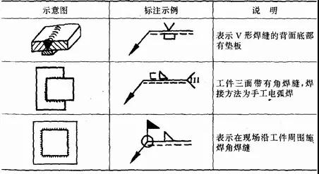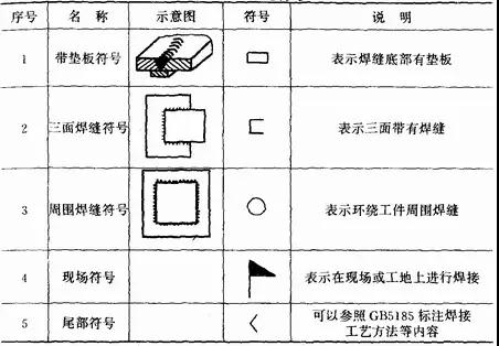 補(bǔ)充符號(hào)是為了補(bǔ)充說(shuō)明焊縫的某些特征而采用的符號(hào),見(jiàn)表1—7。應(yīng)用示例見(jiàn)表1—8。