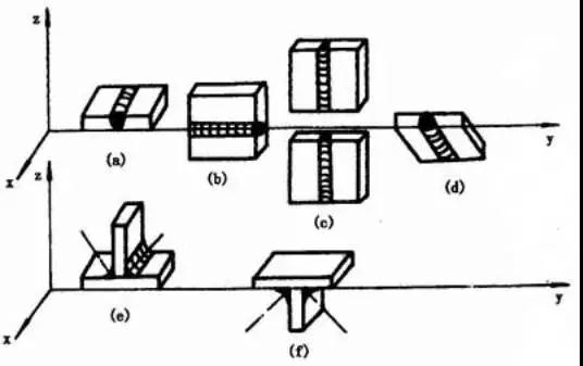 (a)平焊 (b)橫焊 (c)立焊 (d)仰焊 (e)平角焊 (f)仰角焊