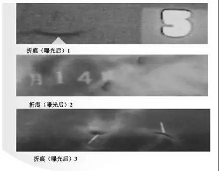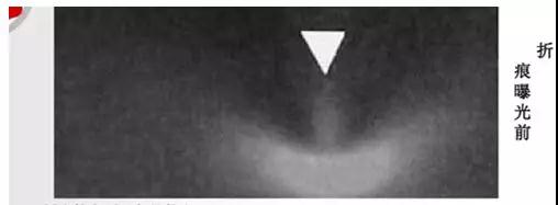 折痕(曝光前)的表征為白月牙狀顯示,其密度低于鄰近的膠片區(qū)域(黑度較低)。