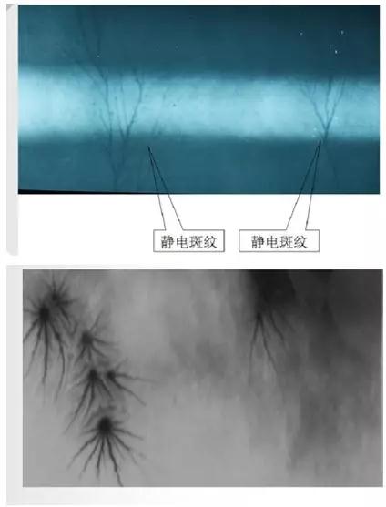 靜電曝光斑點(diǎn)的表征為鋸齒狀分支黑線或不規(guī)則且密集的黑色小點(diǎn)。