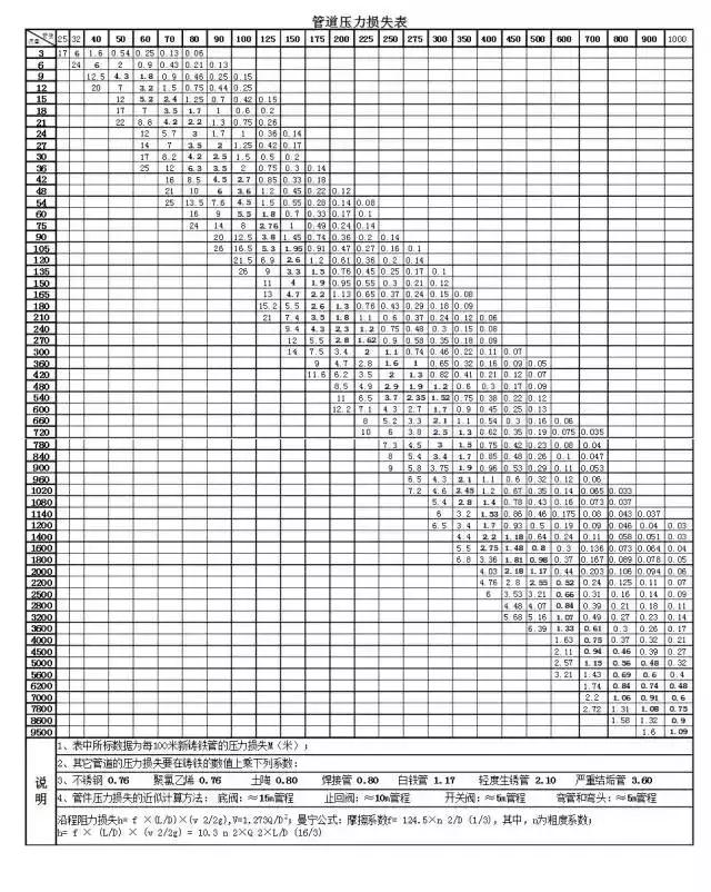 一般情況下90度彎管比120度彎管阻力大,每一90度彎管揚(yáng)程損失約0.5-1米,每20米管道的阻力可使揚(yáng)程損失約1米。此外,有部分用戶還隨意更改水泵進(jìn)、出管的管徑,這些對(duì)揚(yáng)程也有一定的影響。那,管道阻力對(duì)揚(yáng)程的影響究竟有多大呢?下面,我們來看下方表格。