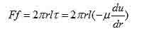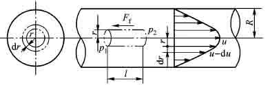 如上圖所示,液體在直徑d的圓管中作層流運(yùn)動(dòng),圓管水平放置,在管內(nèi)取一段與管軸線重合的小圓柱體,設(shè)其半徑為r,長度為l。在這一小圓柱體上沿管軸方向的作用力有:左端壓力p1,右端壓力p2,圓柱面上的摩擦力為Ff。則其受力平衡方程式為: