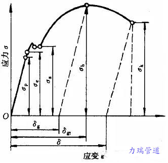 工程應力 σ=F/A0 ;工程應變ε=ΔL/L0;比例極限σP;彈性極限σε;屈服點σS;抗拉強度σb;斷裂強度σk。
