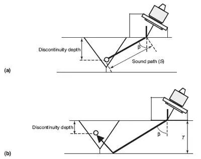 我們使用簡單的幾何公式,基于折射角(β)、聲程(S)和基體金屬的厚度(T)來計算不連續(xù)面的深度: