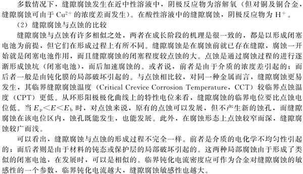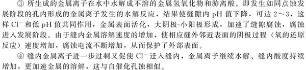縫隙內金屬產生的一種局部腐蝕形態,總稱為縫隙腐蝕??p隙包括金屬與金屬間形成的縫隙、金屬與作為法蘭盤連接墊圈等的非金屬材料 (塑料、橡膠、玻璃、纖維板等)接觸所形成的縫隙,以及腐蝕產物、砂粒、灰塵、污物、海生物等沉積或附著在金屬表面上所形成的縫隙等,在一定電解質溶液中都會在縫隙的局部范圍內產生嚴重的腐蝕。