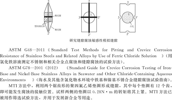 評價材料抗縫隙腐蝕性能的標準方法主要有浸泡試驗和電化學試驗。對于浸泡試驗法,設計形式多樣的人造縫隙,采用多種腐蝕介質,一般以腐蝕質量或腐蝕深度評定試驗結果;電化學測試方法是以某些電化學參數作為判據,來比較金屬材料對縫隙腐蝕的相對敏感性,一般來說,電化學測試方式可縮短縫隙腐蝕的誘導期而達到加速腐蝕試驗的目的。浸泡試驗法包括三氯化鐵實驗、縫隙腐蝕的加速試驗方法、多縫隙腐蝕試驗、 MTI 試驗、 CCT 法等;電化學測試方法包括 ASTM 標準試驗方法、恒電位試驗、動電位極化試驗法、遠距離縫隙裝置試驗等。