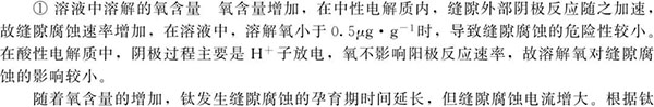隨溫度的升高,鈦的縫隙腐蝕程度加劇,孕育期縮短。當溫度低于 85℃ 時, Ti-Pd 合金在高濃度氯化物的實驗條件下, 120h 實驗期間未發生縫隙腐蝕。