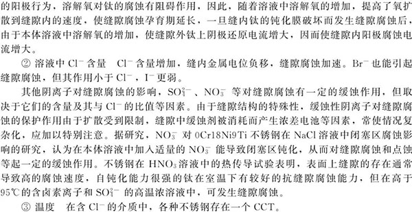 一般溫度升高加速陽極反應,但溫度變化對縫隙腐蝕的影響是比較復雜的。因為溫度對各相關因素產生不同的甚至是相反的影響。一方面,溫度升高使傳輸過程及反應動力學加速,從而增大陽極反應速度;但陽極和陰極兩種反應類型可能發生變化;另一方面,在敞開體系的溶液中,溶解氧的含量隨溫度升高而下降,大約在 80℃ ,不銹鋼的縫隙腐蝕達到極大。在封閉體系中,溫度升高通常使縫隙腐蝕速度加快。此外,溫度還可能對點蝕電位、水解平衡以及表面膜的成分、結構和性能等產生影響從而影響到縫隙腐蝕。