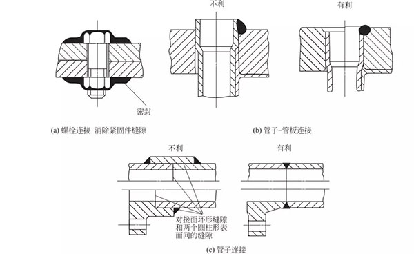 在壓力容器的設計與制造工藝上盡量不造成縫隙結構是避免其受到縫隙腐蝕最有效的方法。盡可能避免采用金屬和非金屬的連接,設計上盡量采用滿焊結構,用焊接代替鉚接或螺栓連接;用對接焊接不用搭接;搭接焊的縫隙要用連續焊、釬焊或捻縫的方法將其封塞。焊接時,在接觸溶液的焊縫一側盡量避免孔洞、未熔合和裂紋等缺陷。應保證容器在排空時無殘留溶液存在,設計上避免銳角和靜滯區 (死角)使結構能夠完全排流,以防生物或碎屑等在這些部位的集積,或出現沉淀時能及時清除;用不腐蝕的堵縫劑或用焊接來封閉已存在的縫隙;連接部件的法蘭盤墊圈采用非吸水性材料 (如在可能的條件下采用聚四氟乙烯等材料);在裝配前,接合面要刷涂料或覆蓋涂層、堆焊耐縫隙腐蝕材料。圖 4-47 為防止縫隙腐蝕可采用的幾種方法示意圖, (a)為螺栓連接,采用密封膠填充縫隙,消除緊固件縫隙;(b)管板式換熱器,管板與管束脹接段盡可能完全與管板厚度一致;( c )管子采用對接而不用插接;(d)避免夾套焊縫與筒體間產生縫隙;( e )容器采用支座支撐,如平底容器底部直接坐于地面,應采取措施填充底部與地面的縫隙。