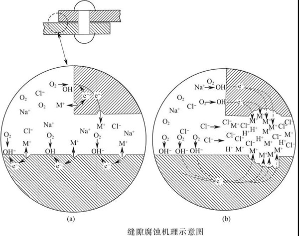 現在普遍為大家所接受的縫隙腐蝕機理是氧濃差電池與閉塞電池自催化效應共同作用的結果。腐蝕開始時,縫內、外氧濃差增加,縫內金屬的電位變負,使縫內陽極溶解速度增