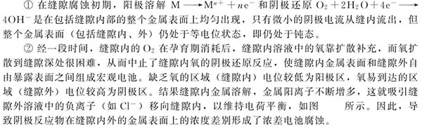 縫隙腐蝕的一個重要特征是,由于特殊的幾何形狀或腐蝕產物在縫隙、蝕坑或裂紋出口處的堆積,使通道閉塞,限制了腐蝕介質的擴散,使腔內的介質組分、濃度和pH值與整體介質有很大差異,從而形成了閉塞電池腐蝕。陰極反應物 (如溶解氧)可以很容易地通過對流 (自然對流和強制對流)和擴散抵達縫隙外的金屬表面,因僅能通過縫隙的窄口以擴散方式進入縫隙,所以,抵達縫隙內部的停滯溶液中的氧很少。因此,早期大多數理論認為縫隙腐蝕是由于金屬離子和溶解氣體在縫隙內外介質中濃度不均勻,形成濃差電池所致。如較早的兩種理論:一是在 20 世紀 20 年代提出的金屬離子的濃差電池,另一理論是 Evans 提出的充氣不勻電池,即氧的濃差電池。