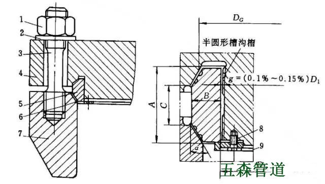 6-軟金屬墊片;7-圓筒端部;8-螺栓;9-托環