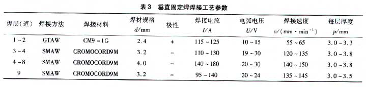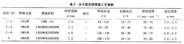 (1)P91鋼管規格為¢325.5mm×29.5mm,焊接材料由AEC提供,包括¢2.4mm的CM-91G焊絲,¢3.2mm和¢4.0mm的CROMOCORD9M焊條,熔敷金屬化學成分見表1。