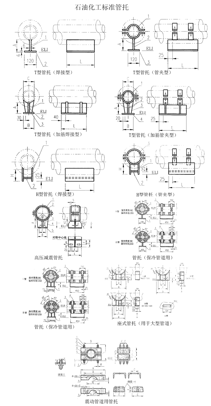 J1 T型管托(焊接型)、J2 T型管托(管夾型)、J3 T型管托(加筋焊接型)、J4 T型管托(加筋管夾型)、J5 H型管托(焊接型)、J6 H型管托(管夾型)、J7高壓減震管托、J8 T型管托(保冷管用)、J9 H型管托(保冷管用)、J10座式管托(用于大型管道)、J13 震動管道用管托。